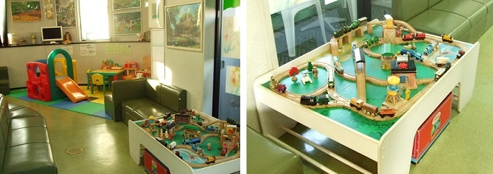 広めのキッズスペースがあり、滑り台などの大きな遊具や絵本、おもちゃが置いてあります。患者様から寄贈して頂いた、全て木製のトーマスの機関車セットもあり、子ども達はよく夢中で遊んでいます。大変有り難く思っています。少しでもお子さんが退屈せずに、安心して、楽しみに来院して頂ければと思っています。